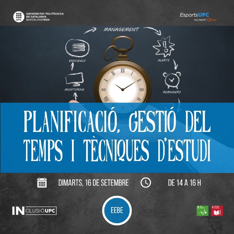 L'Escola d'Enginyeria de Barcelona Est (EEBE) acull dimarts 16 de setembre la primera edició del taller "Planificació, gestió del temps i tècniques d'estudi", que tindrà lloc de 14 h a 16 h, adreçat a l'alumnat.