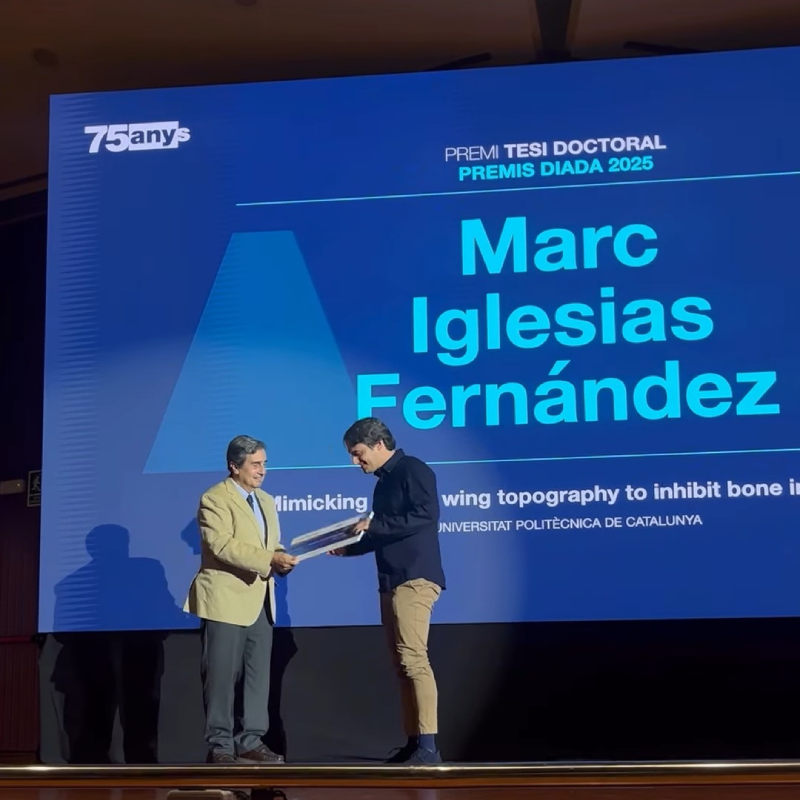 Marc Iglesias Fernández, doctorand del grup de recerca en Biomaterials, Biomecànica i Enginyeria de Teixits (BBT) de l'Escola d'Enginyeria de Barcelona Est (EEBE) de la Univeristat Politècnica de Catalunya · BarcelonaTech, ha estat guardonat amb el premi a la millor Tesi Doctoral per Enginyers Industrials de Catalunya. El seu projecte, titulat “Imitació de la topografia de les ales d’insectes per inhibir la infecció òssia”, ha estat seleccionat entre 40 tesis doctorals presentades d'arreu de Catalunya, destacant pel seu potencial revolucionari en l'àmbit de la salut.